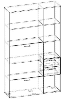 Применение задней стенки из ЛДСП (в ячейках с ящиками и фасадами) позволяет использовать данный стеллаж для зонирования пространства (чтобы предотвратить опрокидывание, необходимо обеспечить крепление стеллажа к стене).