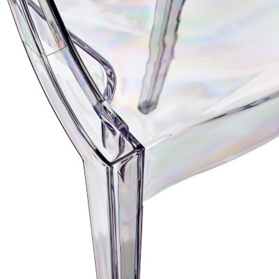 Стул изготовленный из литого полупрозрачного поликарбоната в сочетании с классическими формами спинки и подлокотников - это пример успешного сочетания классических форм и современной индустрии производства.