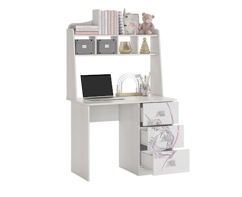 Стильный и модный стол детской «Фэнтези» - обрадует каждого ребенка. Компактный стол прекрасно впишется даже в маленькое пространство детской комнаты. Удобная столешница подойдет как для письма, так и для занятий на компьютере или ноутбуке. Открытые полки надстройки стола хорошо подходят для хранения учебников и школьных принадлежностей. В 3-х выдвижных ящиков поместится все, что необходимо для учебы и творчества. Необычный принтерный рисунок на фасадах выдержан в общем стилистическом решении. Рисунок устойчив к истиранию и ультрафиолету.