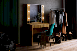 Трюмо Адам — это идеальное сочетание стиля и практичности. С широким фацетированным зеркалом, в котором встроена подсветка из 6 лампочек, оно создает атмосферу профессиональных студий визажистов прямо у вас дома. Комфорт и функциональность обеспечиваются дополнительными элементами, такими как выключатель, розетка для фена и выдвижной ящик для хранения украшений и косметики. Элегантные закругленные углы завершают дизайн, делая его идеальным дополнением к вашей спальне.