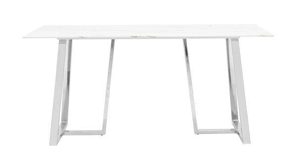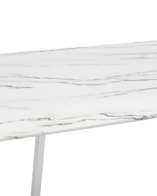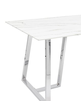 Обеденный стол с красивой стеклянной столешницей белого цвета с рисунком под мрамор. Красивая столешница гармонирует с металлическими ножками оригинальной формы. Такое сочетание смотрится эффектно в любом интерьере. Эта модель подойдет для большой семьи или в дом, где часто бывают гости. Габариты и форма стола позволяют свободно разместить 6-8 человек. Основание стола покрыто порошковой краской и крепится к плите МДФ с обратной стороны стеклянной столешницы. В основании ножек – подпятники для предотвращения царапин на полу. По высоте не регулируются.