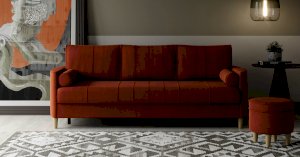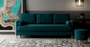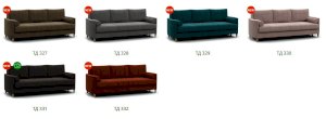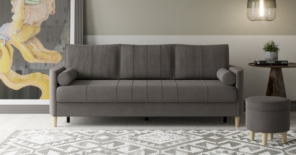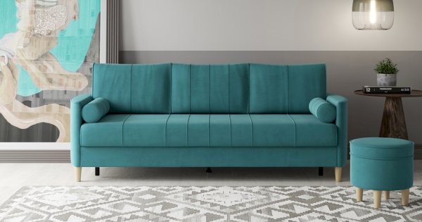 Комплект состоит из прямого и углового диванов, кресла для отдыха и пуфа.