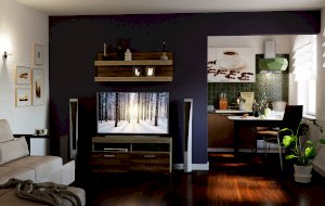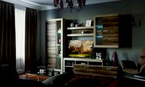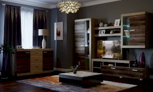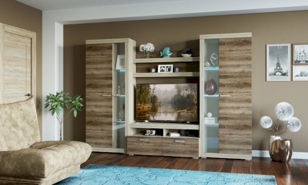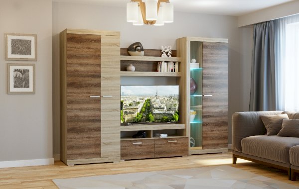 В гостиной Соната применяются современные европейские декоры: корпус выполнен из ЛДСП Дуб сонома, фасад из ЛДСП Дуб Сакраменто. Декоры отличаются выраженной тёплой древесной текстурой, а фасадная часть подчёркнута горизонтальными линиями текстуры и стильными планками МДФ, представляющими собой элементы корпуса и фасада.