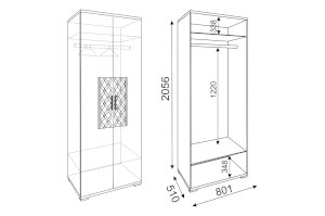 • Шкаф имеет отделение со штангой для вещей на вешалках и 2 полки: съемную нижнюю и жесткую верхнюю.