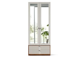 и верхнее - за распашными дверями с зеркалами с отделением для шляп и штангой для одежды под верхней полкой.