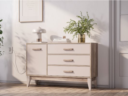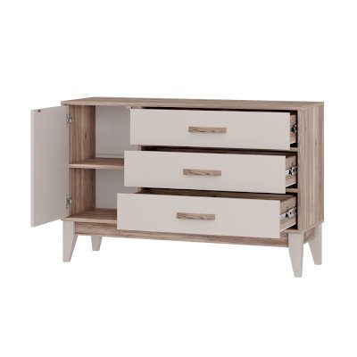 Комод «Скандика» КМ-12 – это не только вместительная, но и стильная модель, которая украсит вашу гостиную или спальню. Полка за дверцей подойдет для хранения важных мелочей, небольшой техники, фотоальбомов. Три просторных ящика позволят удобно рассортировать белье и одежду. Створка плотно фиксируется на магнитах.