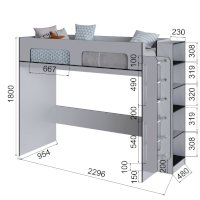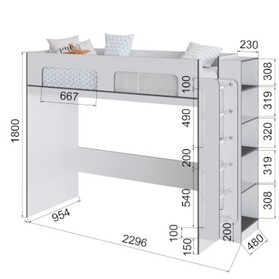 Кровать чердак спроектирована под одно спальное место и может дополняться вторым спальным местом (кровать с ящиками) или рабочим местом (шкаф малый, письменный стол).