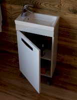 1 дверца; 1 полка ЛДСП; ручка врезная металлическая хромированная, опоры квадратные регулируемые.