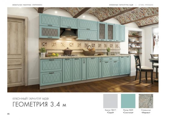 Набор кухонной мебели «Геометрия» получил свое название благодаря оригинальному дизайну. Дело в том, что его фасады украшены незатейливыми симметричными узорами, состоящими из небольших ромбов. Также комплекту присущи симметрия и простота форм. У покупателей есть возможность выбирать цветовое решение: в ассортименте изделия оттенков топаз, тирамису, гранат, алмонд.