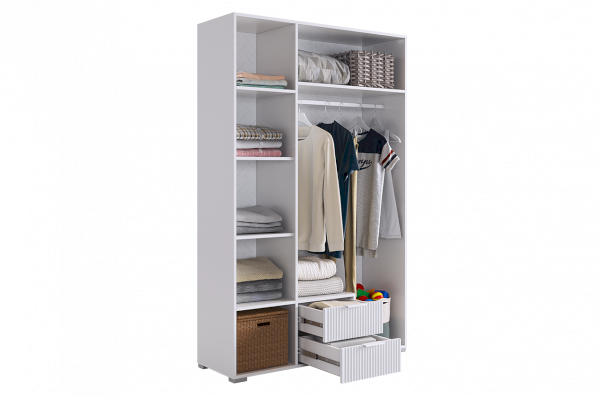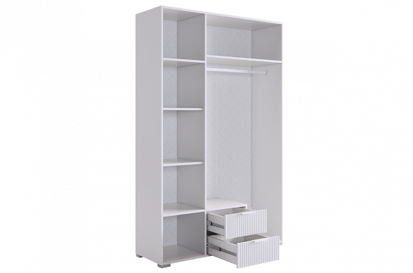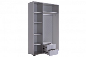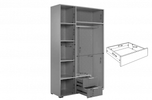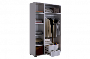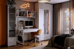 Комплектация: Полка 2 шт., трехдверный шкаф, трехдверная антресоль, однодверный шкаф, стол