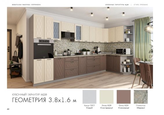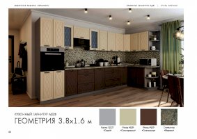 Набор кухонной мебели «Геометрия» получил свое название благодаря оригинальному дизайну. Дело в том, что его фасады украшены незатейливыми симметричными узорами, состоящими из небольших ромбов. Также комплекту присущи симметрия и простота форм. У покупателей есть возможность выбирать цветовое решение: в ассортименте изделия оттенков топаз, тирамису, гранат, алмонд.