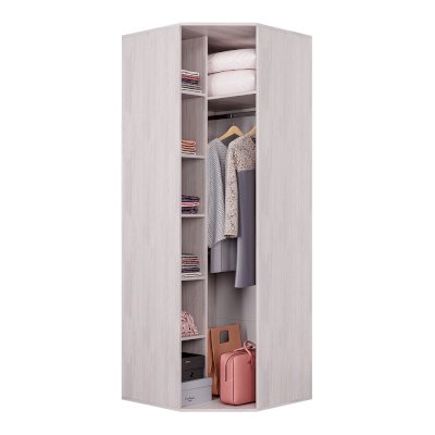 Красивая модель углового шкафа Кимберли выполнена из светлой ЛДСП цвета ясень белый. Фасад распашной дверцы сделан в стиле всей одноимённой коллекции и имеет декоративный фацет и гравировку. Внутри модель разделена на две зоны: для одежды на плечиках предусмотрена хромированная штага, а для других вещей – вместительные полки. Идеальным дополнением является небольшая металлическая ручка.