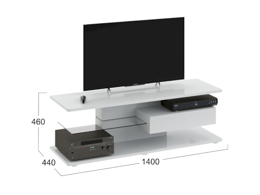 Тумба ТВ оснащена открытыми полками, выдвижным ящиком и широкой поверхностью подставки под телевизор. Ящик тумбы оборудован системой полного выдвижения, благодаря чему обеспечивается доступ к внутреннему пространству.