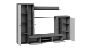 Гостиная «Амстердам» является единой композицией, где пространство шкафа разделено вертикально на две части. За стеклянной дверью и глухим фасадом предусмотрены вместительные отделения с полками для хранения любых вещей и аксессуаров. Наполнение тумбы под ТВ, где прекрасно разместились открытые и закрытые ниши, создает идеальную систему для хранения различных предметов, которые используются в повседневной жизни.