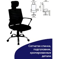 Высокая сетчатая спинка и подголовник, выраженная поддержка поясницы, прочные пластиковые подлокотники, хромированное пятилучие гарантируют комфортное долгосрочное использование.